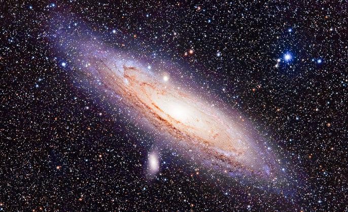 안드로메다 은하는 우리 은하와 유사하지만 더 크며, 약 250만 년 떨어진 곳에 있는 눈으로 볼 수 있는 가장 먼 천체 중 하나입니다. 다른 대부분의 천체와 달리 안드로메다 은하는 우리에게 점점 다가오고 있으며, 수십억 년 내에 우리 은하와 충돌하여 융합될 것으로 예측되고 있습니다.