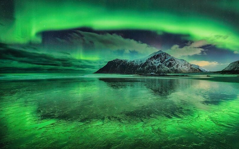 오로라 부문의 준우승작은 바로 오로라 사진의 아름다움을 압축시킨 것처럼 보입니다. 노르웨이의 로포텐 제도에서 촬영된 이 사진은 눈으로 덮인 산 주변을 거대한 오로라가 마치 빛의 커튼으로 덮고 있는 모습입니다.