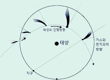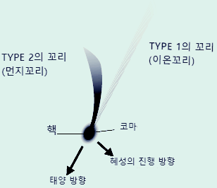 핵에서 방출된 가스나 먼지가 벋어 혜성의 꼬리가 됩니다. 가스는 태양에서 불어 오는 태양풍에 의해서 태양의 반대편으로 거의 곧게 뻗어 갑니다. 이를 타입 I의 꼬리 또는 이온 꼬리라고 합니다. 먼지는 핵에서 방출 속도와 혜성 본체의 속도와의 관계로 새로운 태양 주회 궤도를 운동하게 됩니다. 이때 방출 시기와 먼지의 크기 분포 등 여러 요소가 얽혀서 곡선 모양으로 뻗어 갑니다. 이를 타입 II의 꼬리 또는 먼지 꼬리 라고 합니다.
