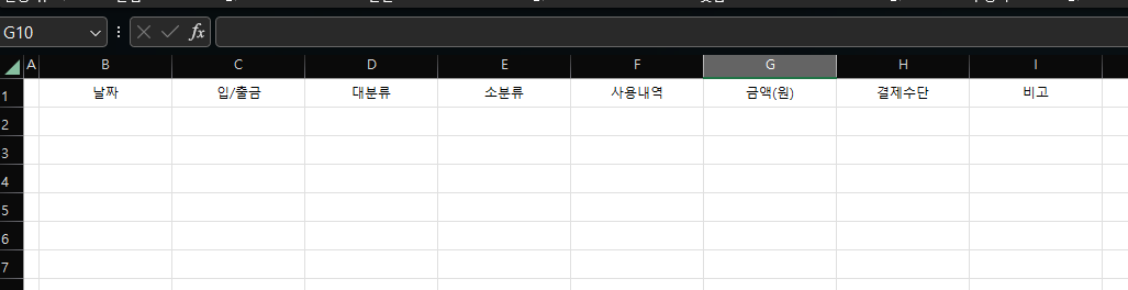 저는 데이터 입력을 위해 날짜/입출금/대분류/소분류/사용내역/금액/결제수단/비고 의 항목을 아래와 같이 작성 하였습니다.