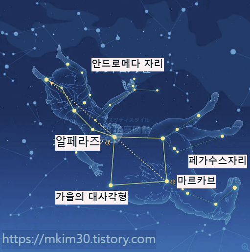 안드모메다 공주의 머리에 해당하는 2등성 알페라즈 (α별)은 안드로메다 자리 별이지만 다을의 대사각형으로 페가수스를 만드는 별이되고 있습니다.