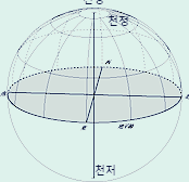 우리 머리 바로 위로 뻗은 선과 천구면의 교차점을 천정이라 하고 반대로 뻗은 선 (땅을 뚫고)과 천구면의 교차점은 천저라고 합니다.(왼쪽)