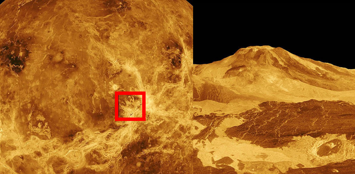 이미지 설명에 따르면, 금성 전체를 밝은 노란색으로 보이며, 표면의 차이를 나타내는 어두운 노란색 패치가 있습니다. 중간 오른쪽 섹션에는 검은색 사각형으로 표시된 화산 활동이 발견된 지역이 있습니다. 또한 3D 모델 이미지는 화산인 Maat Mons의 정상과 화산 활동의 징후를 보여주는데, Maat Mons의 통풍구 중 하나가 1991년 8개월 동안 폭발 사건이 발생했음을 보여줍니다. 화산의 경사는 그리 가파르지 않으며, 산이라기보다는 언덕처럼 보입니다.