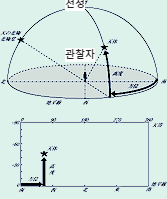 그림과 같이 지평 좌표는 방위(방향:Azimuth)와 고도(높이:Altitude)를 나타내는 2개의 수치로 구성된 좌표계입니다.