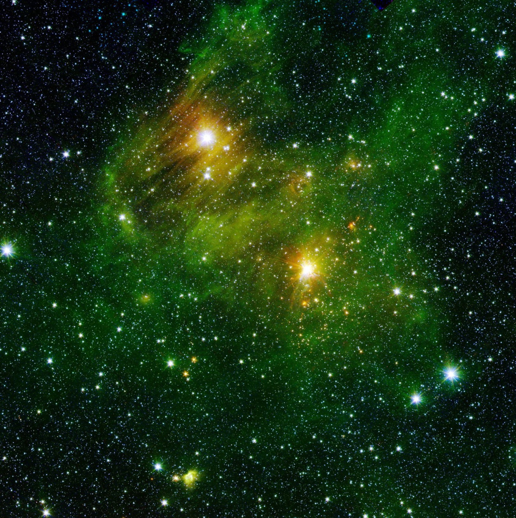 2009년 은퇴한 스피처 우주 망원경이 포착한 수소와 탄소 화합물로 이루어진 녹색 안개를 보여주는 이미지 입니다.
