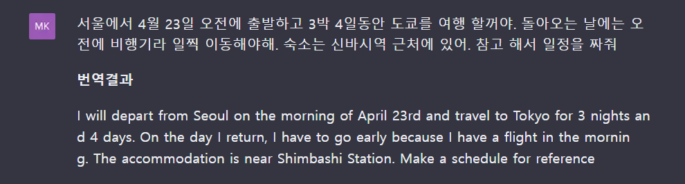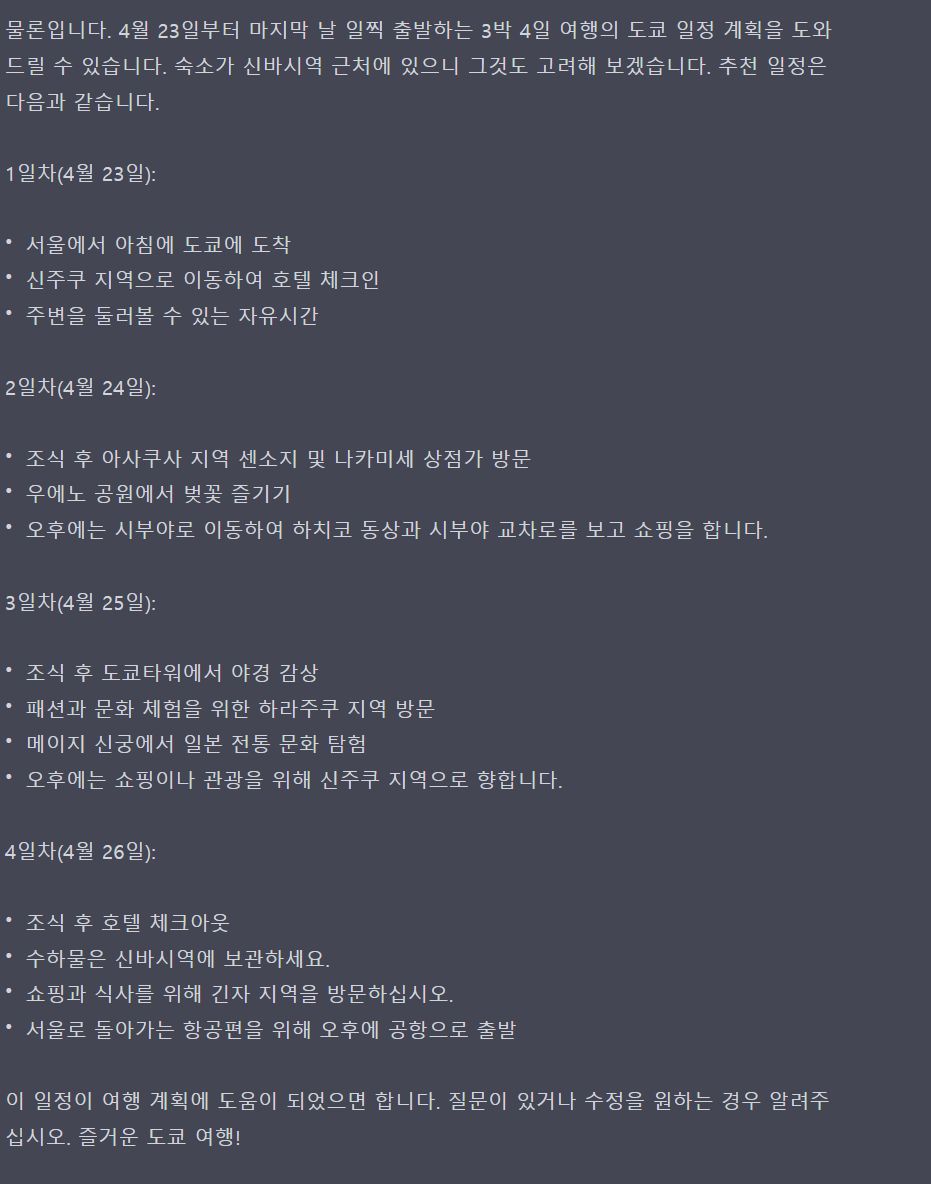 | Chat GPT 에게 일본 일정 짜 달라고 부탁하기 2 : 오류 수정하기 (0) | 2023.03.31 |